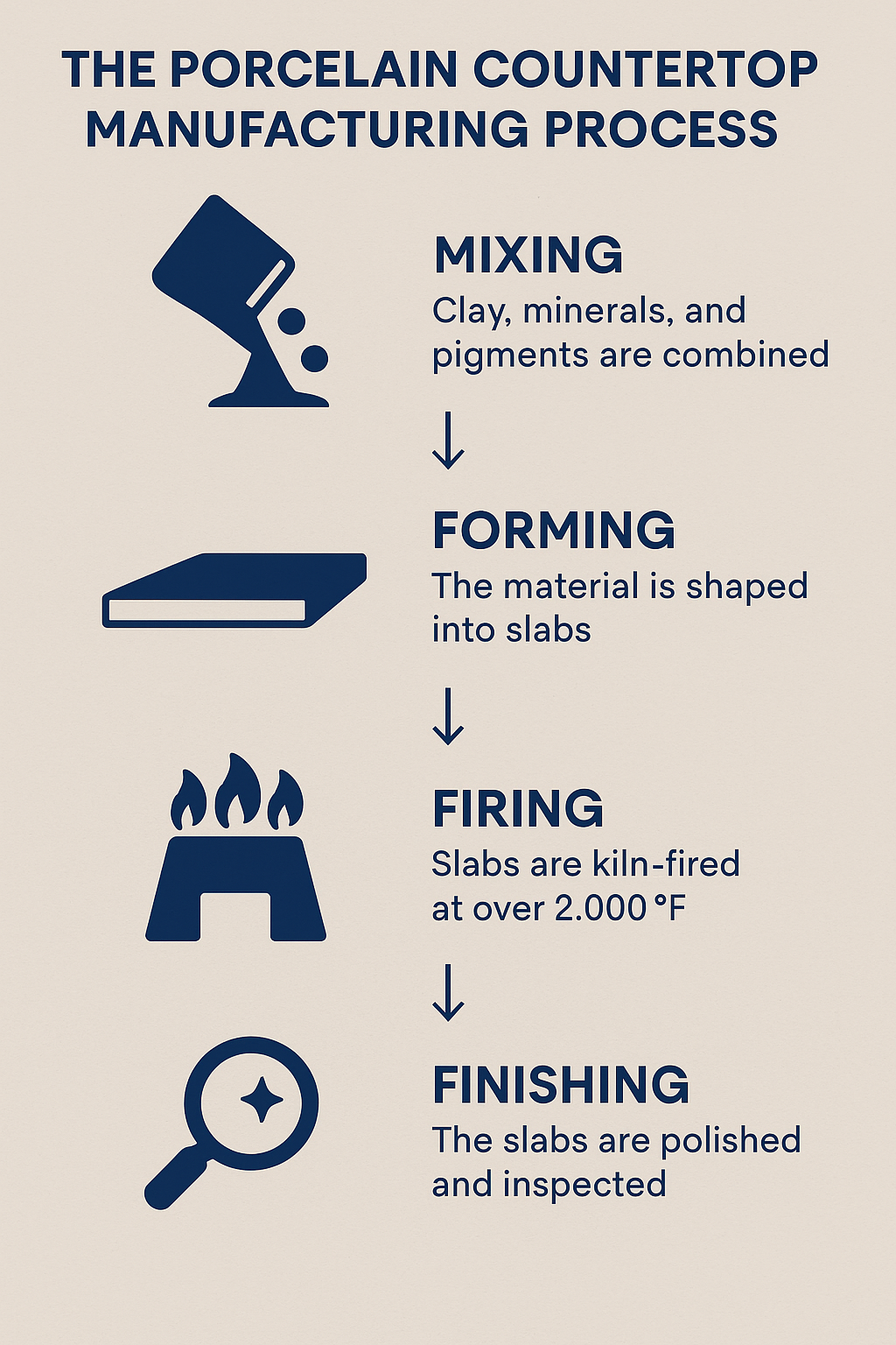 Porcelain countertops are made by firing a natural blend of clay, minerals, and pigments at extremely high temperatures—over 2,000 degrees Fahrenheit. This process creates an ultra-dense, non-porous surface that’s incredibly resistant to chips, scratches, and cracking. In fact, porcelain is harder than granite and on par with quartz when it comes to resisting daily wear and tear.